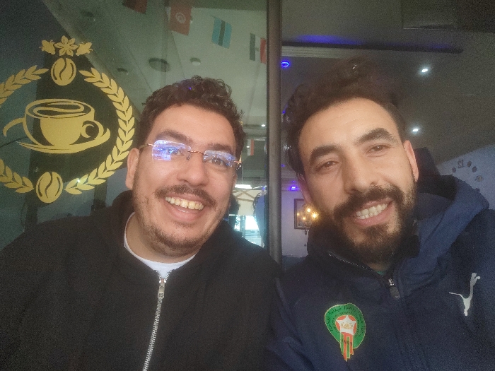 Two adult males are depicted in a close-up, chest-up shot within an indoor cafe or restaurant setting. Both individuals are smiling directly at the camera. The male on the left has dark, curly hair, wears glasses with reflective lenses, and has a mustache and short beard. He is dressed in a black zippered hoodie over a white t-shirt. The male on the right has dark, curly hair and a full beard. He is wearing a dark blue hooded jacket featuring a white Puma logo on the right side and a green and red circular emblem, identified as the Royal Moroccan Football Federation (FRMF) logo, on the left chest. The background behind the left individual consists of a large glass panel adorned with a golden decal of a coffee cup encircled by a laurel wreath and coffee beans. Through this glass, several small national flags are visible hanging on a string, including the Tunisian flag and another flag consistent with the Moroccan design. The background behind the right individual is darker and shows a dimly lit interior with visible wall decorations and a framed object. The presence of the FRMF emblem on the subject's jacket, combined with the visible national flags and cafe setting, places this scene within Morocco, specifically in an urban establishment such as a cafe in the city of Salé.