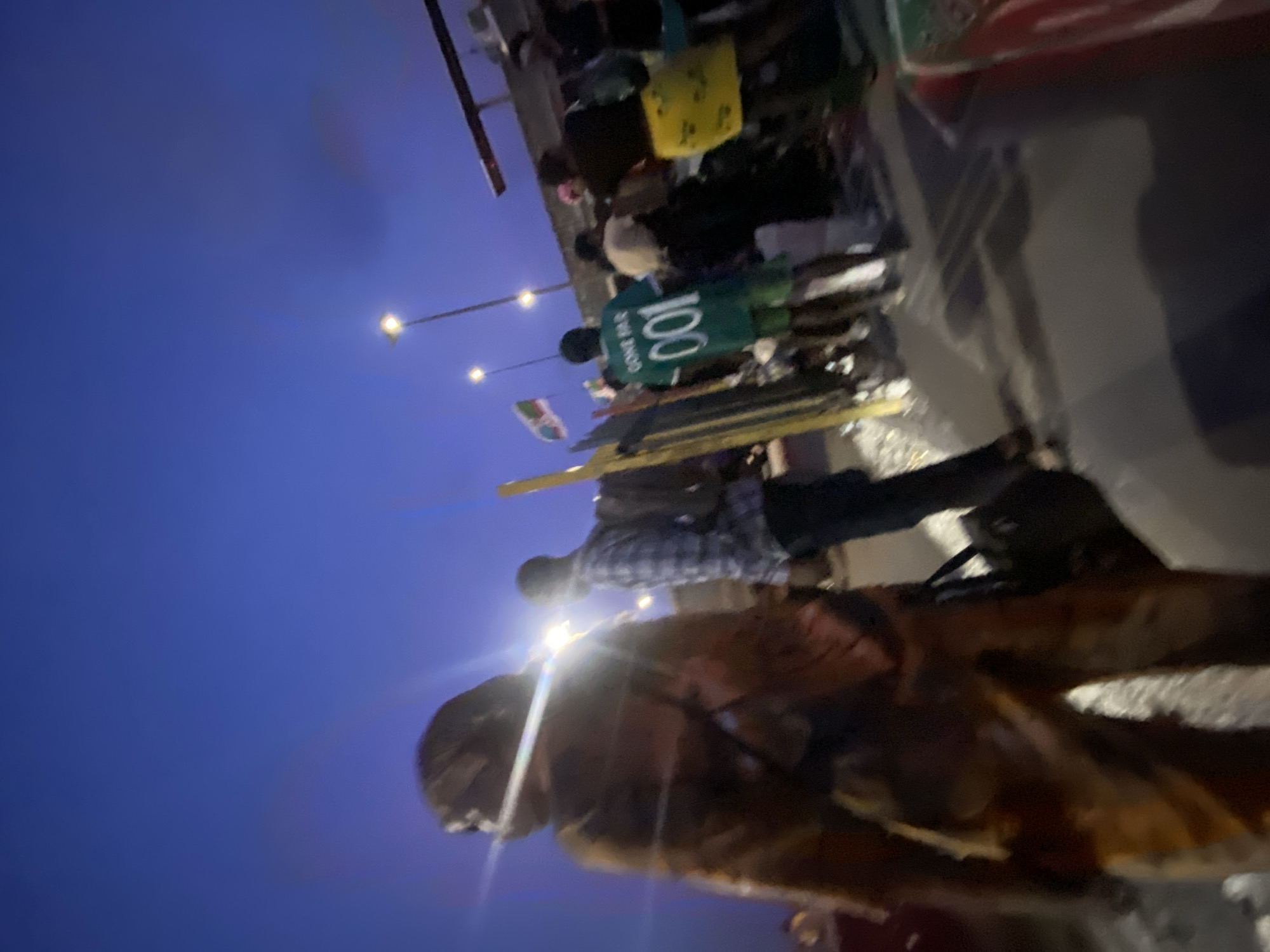 The image depicts a night scene in Lekki, Nigeria. Multiple individuals are present, one wearing a green jersey with the number "100" on the back. Streetlights illuminate the area. The sky is a deep blue.