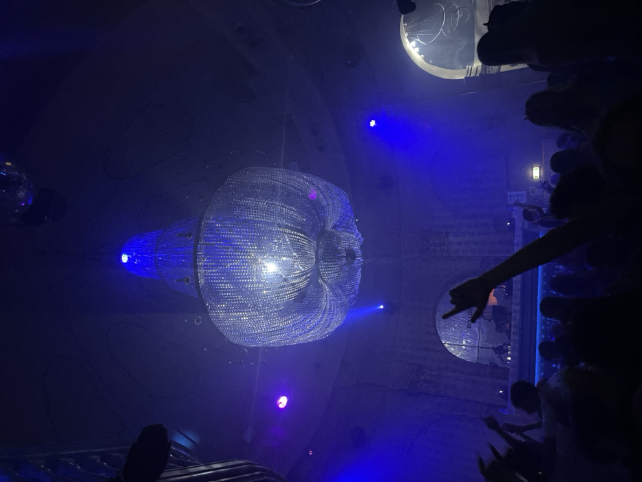 The image depicts a crowded interior scene within the Old Fashion Club in Milan, Italy. A large, multi-tiered crystal chandelier, illuminated by blue light, hangs centrally from a high ceiling. The environment is dimly lit with pervasive blue and purple lighting, creating a nightclub atmosphere, and a disco ball is visible near the top of the frame. Ornate, classical-style architectural elements, including arched recesses and textured walls, are discernible in the background. Numerous people are present, primarily in silhouette in the foreground and midground, with several individuals raising their arms. One person's right arm is prominently raised in the mid-foreground, forming a "rock on" hand gesture. Through a background archway, a raised platform or DJ booth is visible, with a light-colored sign displaying the word "BULLDOG" above it. Light haze or smoke is present, accentuating the visible light beams.