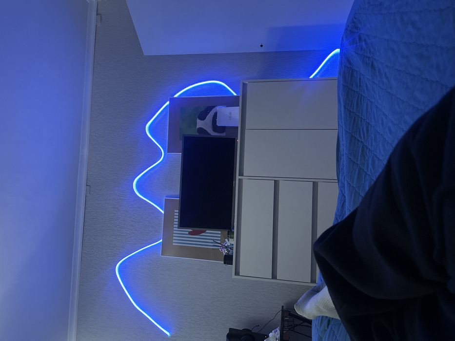 The image, taken in Nekrasovskiy, Russia, depicts an interior room from a low, eye-level perspective, likely from a reclining position on a bed. In the foreground, the lower legs of an individual are visible, clad in dark trousers with a white sock on the visible right foot, resting on a blue quilted blanket. In the midground, a white furniture unit, consisting of three drawers on the left and a two-door cabinet on the right, serves as a console. A dark-screened flat-panel television is centered on top of this unit. To the left of the television, a small container with decorative sticks is present, and to its right, a white box marked "DIOR" is positioned. Behind the television and console, two framed art prints lean against the wall; one on the left features vertical stripes and a heart motif, while the right print displays an abstract design. The background shows a light-colored, textured wall. A bright blue LED light strip is affixed to the wall, forming an undulating, wave-like pattern that extends horizontally above the artwork, curves down the right side of the console, and continues vertically along the wall's corner. A segment of a white wardrobe or cabinet door is visible on the far right. The room is predominantly illuminated by the blue LED strip, casting a pervasive blue ambiance throughout the scene. No other individuals are present, and no active interactions are occurring.
