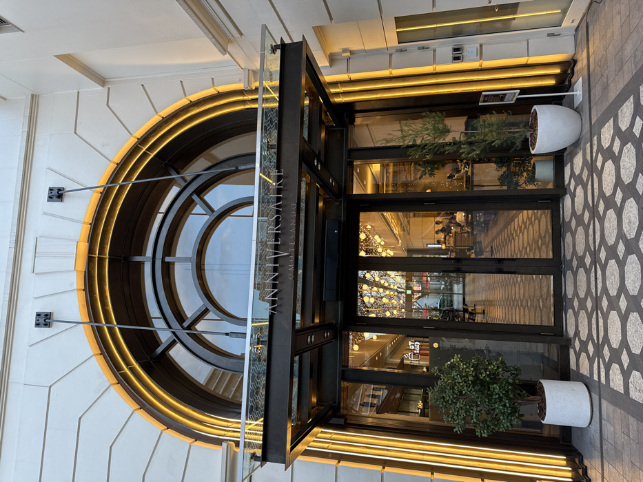 The image displays the exterior of a building. A large, circular window with illuminated edges dominates the left side. Adjacent to it is a glass panel with the word "ANNIVERSAIRE" vertically written. The entrance features dark metal framing and glass doors, with two white planters on either side. Through the glass, interior lighting and furniture are visible. The pavement has a patterned tile design.
