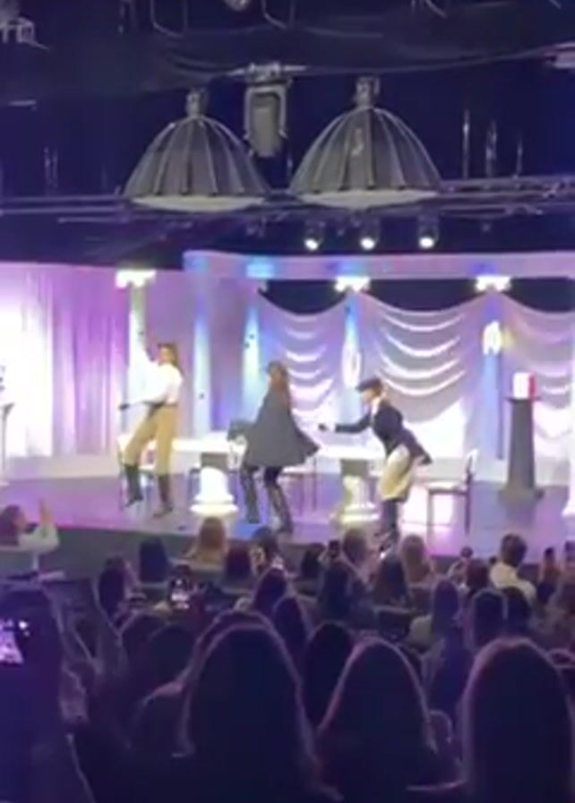 Three performers are on a stage, dressed in what appear to be historical costumes with hats and boots. They are dancing and gesturing to the music. They are in front of a backdrop of white curtains with purple and blue lighting. There are white tables and chairs on the stage. An audience is in the foreground, many holding up phones to record. The stage has lighting fixtures overhead.