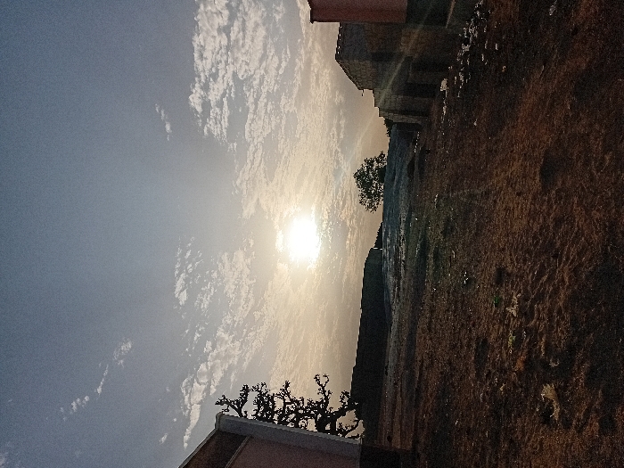 An outdoor scene displays a bright sun partially obscured by thin clouds against a blue sky. Below, a landscape appears dry and rugged, marked by brown vegetation and indistinct structures. A silhouette of a tree stands out against the sky, while the edge of a building frame the bottom of the view. The image conveys a sense of aridness under a vibrant sky.