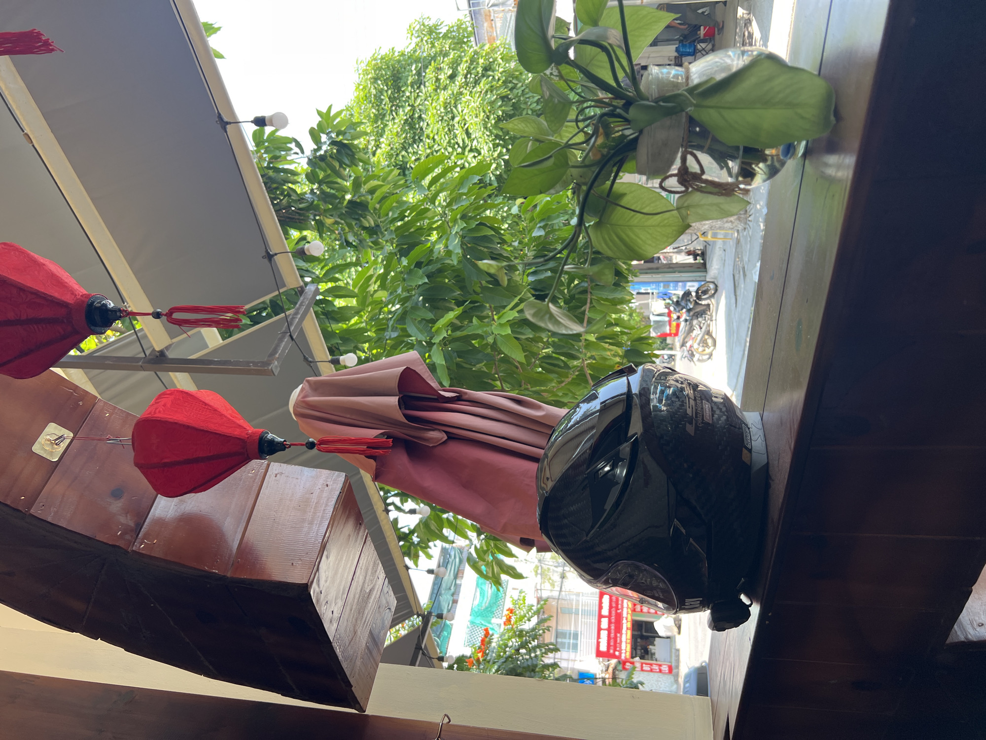 A sideways shot shows a black motorcycle helmet on a dark wooden table, an upturned mauve umbrella, and a red Asian-style lantern. Outside, there is lush green vegetation and a street scene in Nam Nha Trang, Vietnam. In the background, a motorcycle is parked on the street. Red and white signage in Vietnamese is visible in the distance.