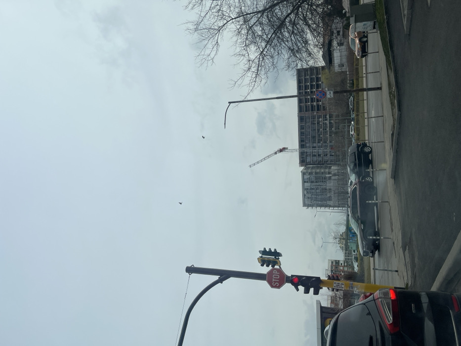 The image displays an urban street scene on an overcast day in Sofia, Bulgaria, characterized by active construction. In the foreground on the left, the rear section of a black SUV, possibly a Ford Kuga, is visible, with its red taillight illuminated. Adjacent to it, a yellow pole supports a red octagonal "STOP" sign and a vertical traffic light, which displays a red signal. A smaller, auxiliary traffic light mounted above it also shows red. On the asphalt road in the midground, a dark-colored SUV is observed moving from left to right, appearing to pass the vehicle from which the photograph was taken. Behind it, another dark SUV is visible. Further down the road on the right, a light-colored SUV is present. To the right of the street, a tall, black street light pole stands beside a bare deciduous tree with dark, leafless branches. A blue circular sign with a red diagonal line, indicating "No Stopping," is attached to the street light pole. In the background, a large construction site features multiple multi-story buildings in various stages of completion. The building on the far left is partially obscured by scaffolding and white protective netting. Adjacent to it, a larger building reveals an exposed concrete frame structure with numerous open floor and window levels, signifying ongoing construction. A prominent red and white tower crane extends vertically above these unfinished structures. The sky is uniformly overcast and light grey. Three dark-colored birds are visible in flight within the upper portion of the sky.