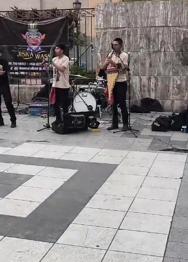 A musical group of six people is performing in a public square. The band includes two guitarists, a drummer, two musicians playing panpipes, and a singer. They are positioned in front of a black banner that reads "JISKA WASHI" with contact information listed underneath. A sound system with two speakers is set up on the right. The square is paved with large, light gray and darker gray tiles. Buildings surround the square, and a low stone wall with greenery is visible behind the band. Pedestrians are walking in the background. The camera moves slightly from left to right during the recording.