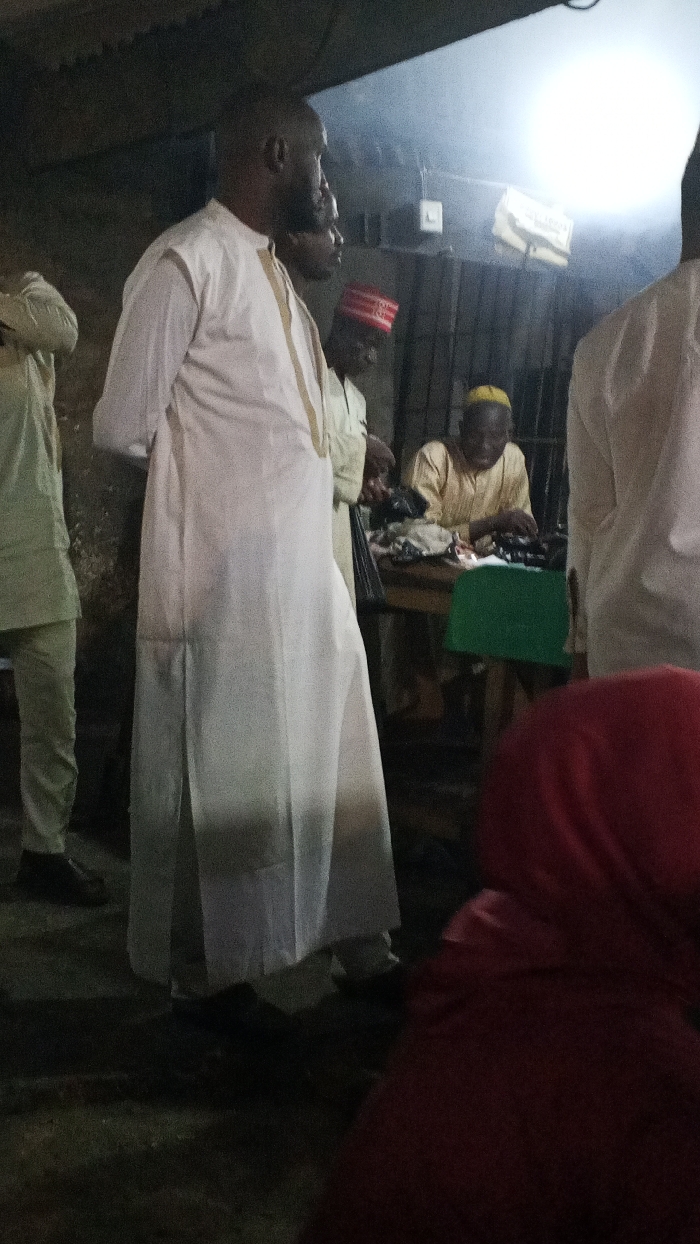 Several men stand indoors, dressed in traditional attire. One man in a white robe is prominent in the foreground. Behind him, a man with a red and white cap stands near a man with a yellow cap sitting at a table. A red headscarf is also visible. The lighting is dim, casting shadows on the surroundings.