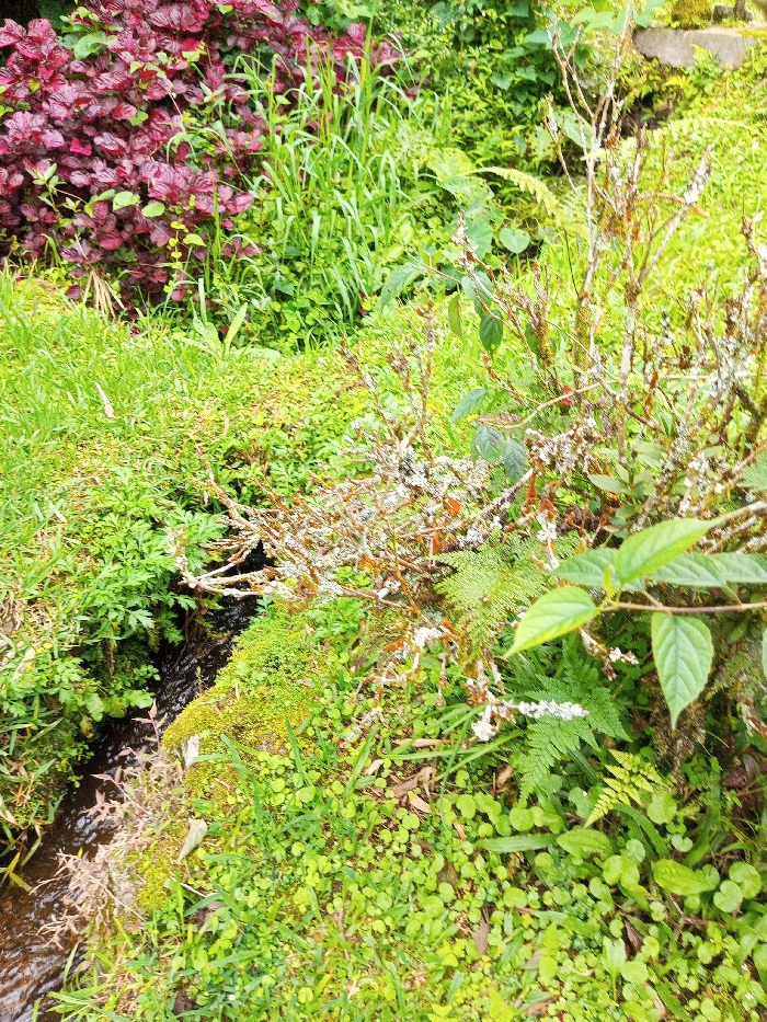 A lush, overgrown garden scene features a narrow stream flowing through dense greenery. Vibrant red foliage contrasts with various shades of green moss, grasses, and ferns. A dry, lichen-covered shrub sits amidst the dense vegetation, adding a textural element. The scene is a vibrant mix of plant life.