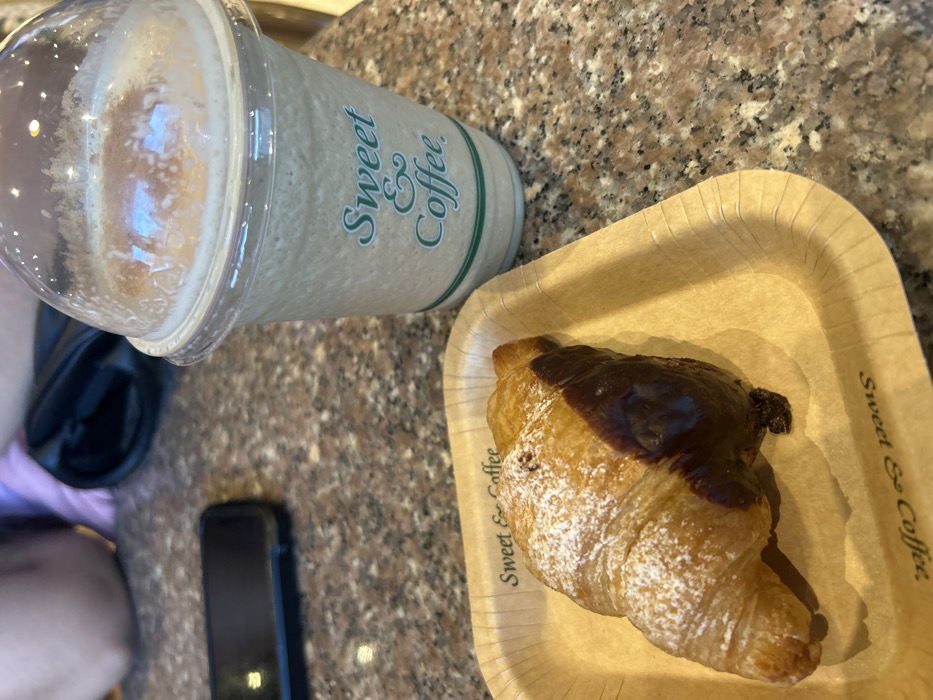 The image displays a close-up, slightly elevated perspective of a table scene within a "Sweet & Coffee" establishment in Guayaquil, Ecuador. In the foreground and midground, a chocolate-dipped croissant, partially covered in powdered sugar, rests on a square, light-brown paper plate. The plate is imprinted with the "Sweet & Coffee" logo. To the right of the croissant, a clear plastic cup with a dome lid contains a light-brown, frothy blended beverage. This cup also features the "Sweet & Coffee" logo in green script. These items are positioned on a polished, brown-speckled granite table surface. In the blurred background, a dark-colored smartphone lies face down on the table. Adjacent to it, a dark bag or purse is partially visible. The extreme upper left corner of the frame shows a blurred portion of a person's upper arm, clothed in a light-colored fabric, indicating an individual seated at the table. No direct actions or interactions are depicted; the scene presents items prepared for consumption.