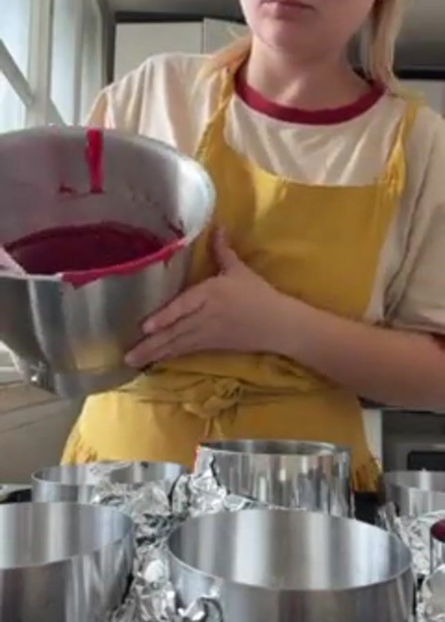 A person wearing glasses and a yellow apron pours red batter from a silver mixing bowl into several circular metal baking molds lined with foil