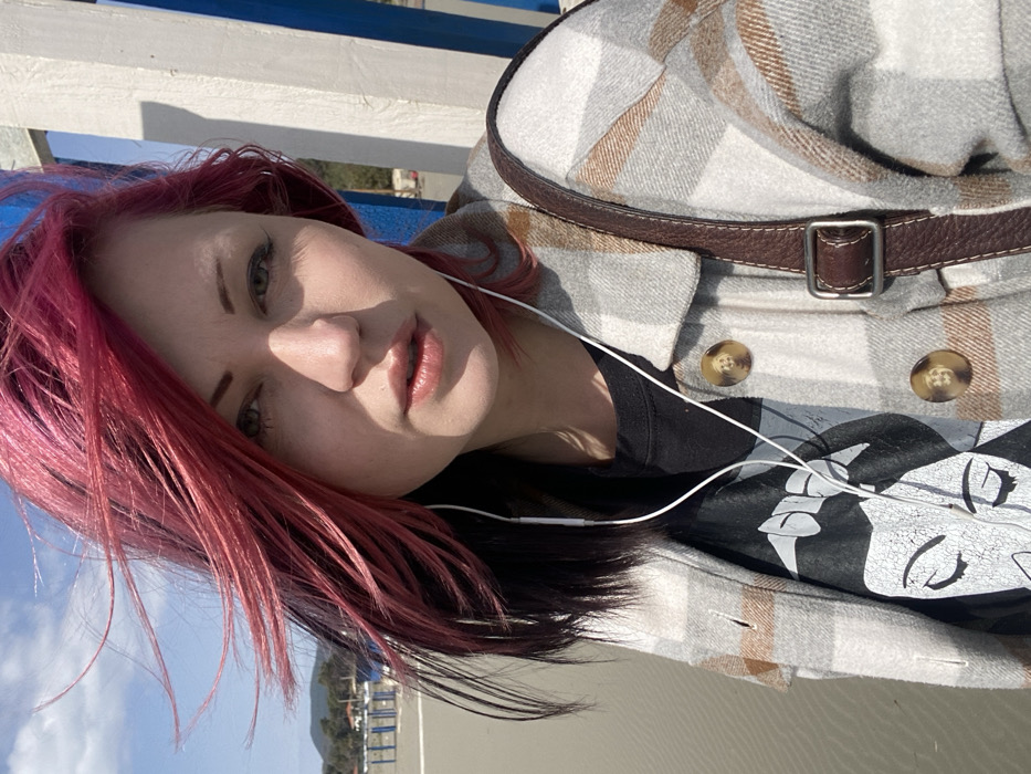A solo female subject with shoulder-length vivid pink and black hair stands facing the camera, her hair partially windblown