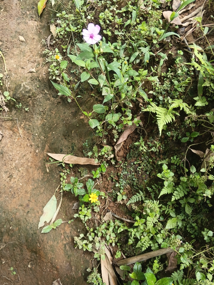 A patch of mixed ground cover grows along a rough, dark earth border. Dominating the foliage are ferns and various green plants. Two flowers punctuate the greenery: a single, light purple flower stands tall amidst broad leaves, while a small yellow flower nestles among smaller plants. Several dry leaves lie scattered across the scene, adding texture to the composition.