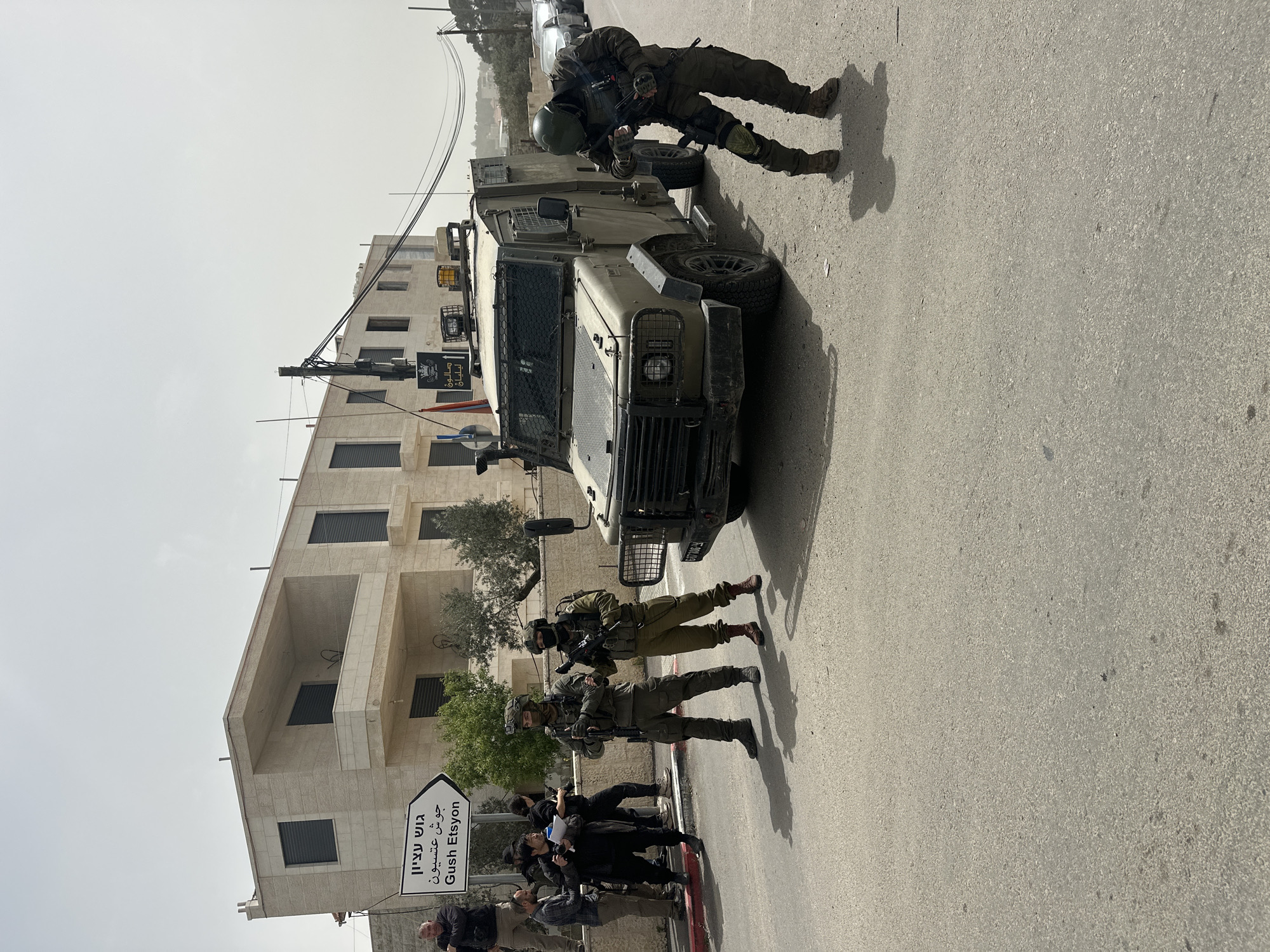 The image depicts a scene in what appears to be a-Doha, Palestinian Territory. An armored military vehicle is parked on a paved street. Several armed soldiers in military uniforms are positioned around the vehicle. Some soldiers are interacting with a group of civilians. A street sign indicates the direction of "Gush Etsyon". A multi-story building is visible in the background. The sky is overcast.