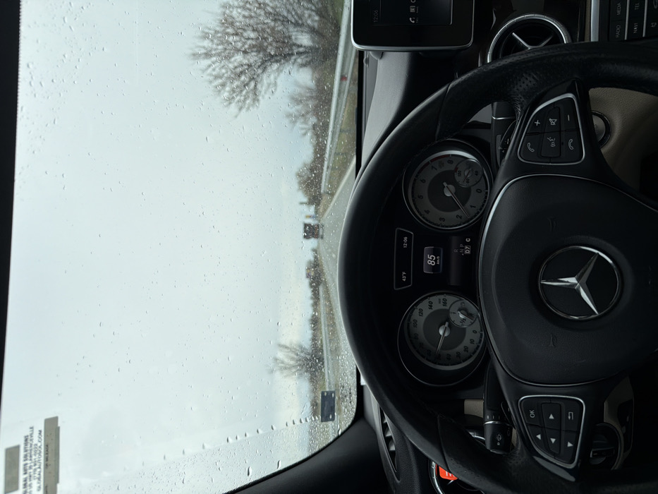 - "The image depicts a first-person view from inside a moving Mercedes-Benz vehicle, showing the steering wheel and dashboard in the foreground, and a wet road ahead through the rain-spattered windshield" by FM-qCCxh2, licensed under CC BY 4.0