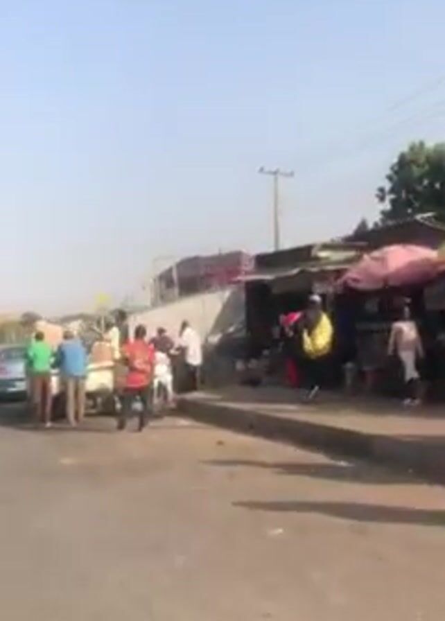 street scene. A red and green van with advertising drives past a group of people gathered around a white pickup truck on the side of the road. A blue sedan then drives past. The camera follows the road showing more people, some gathered around a small roadside stand. A man carries something on his head. There are several buildings visible, power lines overhead, and a fence in the background. The sky is clear and bright.