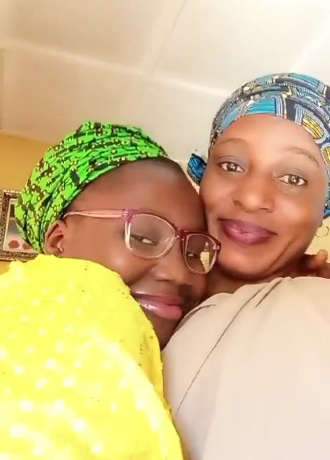Two women pose closely together indoors. The woman on the left wears a bright yellow top with small white dots and a green patterned headscarf. She also wears pink-framed glasses. The woman on the right wears a light beige outfit and a blue patterned headscarf. Both women are smiling and looking at the camera. A framed picture hangs on the wall behind them. The lighting is bright.