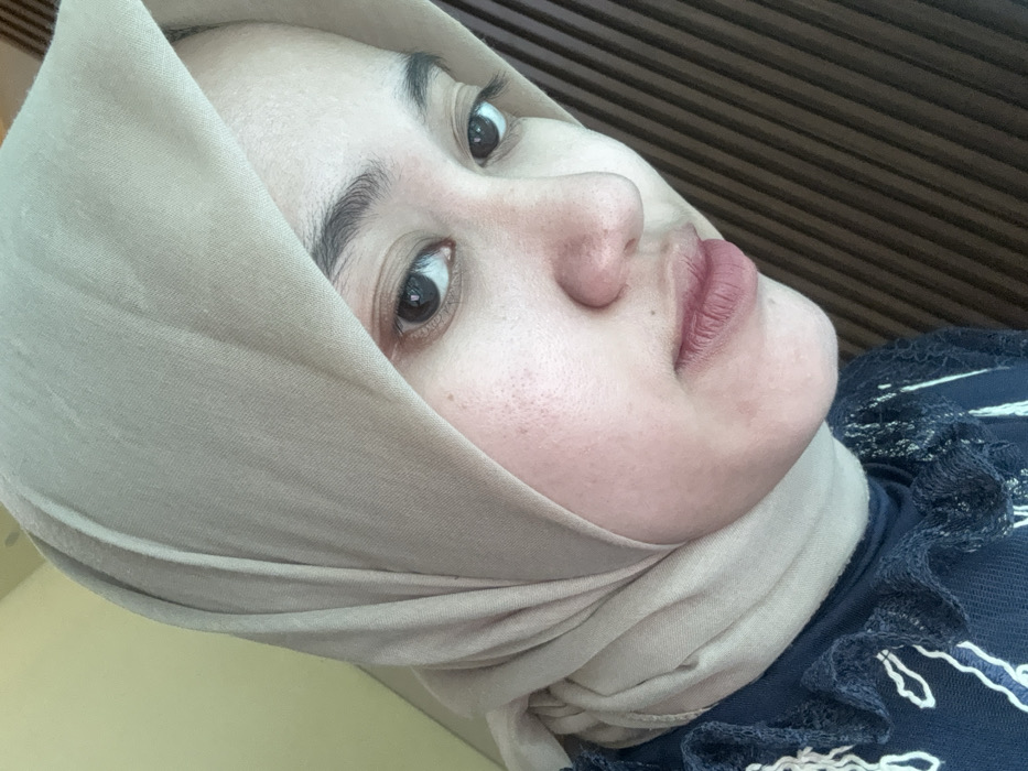 A woman with fair skin wears a beige hijab, partially covering her face