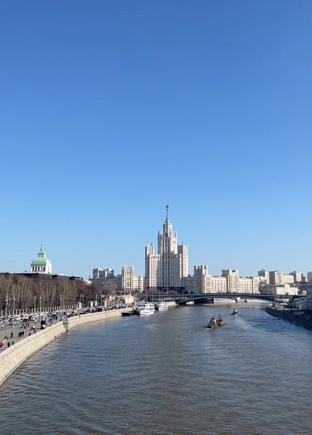 wide, urban river under a clear, bright blue sky. Along the riverbank to the left, there is a paved walkway with people strolling. Across the river, there is a massive, white building complex with a tall, spired central tower. The style of the building is reminiscent of Stalinist architecture. Several smaller boats are visible on the river, and a bridge crosses the waterway in front of the building.