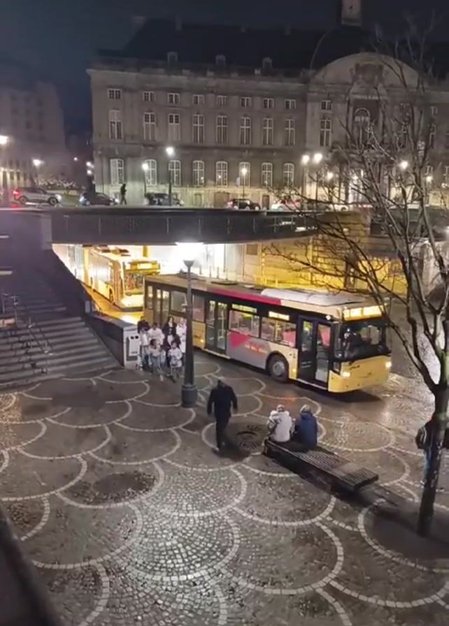 At night, a yellow bus pulls up at an underground bus stop near a city square. Pedestrians board the bus while other people sit on a nearby bench. The cobblestone square is decorated with a swirling pattern. A grand building stands in the background, illuminated by streetlights. Trees are bare. A person walks through the square.