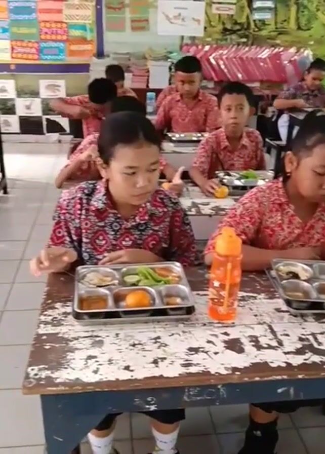 classroom setting where a group of students are eating their lunch. The students are seated at individual desks, and each has a metal tray with several compartments containing different food items. The students are wearing what appears to be a school uniform, with a red patterned shirt and dark bottoms. Some of the female students are wearing white headscarves. The desks are old and worn, with visible scratches and markings. The classroom walls are decorated with colorful posters and educational materials, including a sign that reads "POJOK BACA" (reading corner in Indonesian). There are some water bottles on the tables. The students are focused on their meals, eating with their hands and occasionally looking around the room.