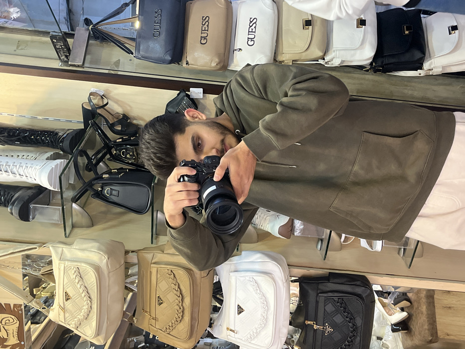 A male individual, likely in his late teens or early twenties, with dark hair, a beard, and a mustache, is centered in the frame, holding a black digital camera with a large lens. He wears an olive-green hooded sweatshirt and light-colored trousers, focusing forward as he operates the camera. The scene is an interior retail establishment, specifically a store displaying handbags and footwear, located in Al-Midan Municipality, Syria. The background features extensive product displays: to the left, numerous handbags in beige, tan, white, and black, some with braided and quilted designs, hang vertically. In the center and right background, glass shelves hold various footwear, including black and white boots, black heels, and other shoes, interspersed with small black handbags. Further right, a vertical arrangement of handbags in blue, tan, white, and black, many displaying the "GUESS" brand logo, is visible. The individual is actively engaged in aiming the camera within this retail environment.