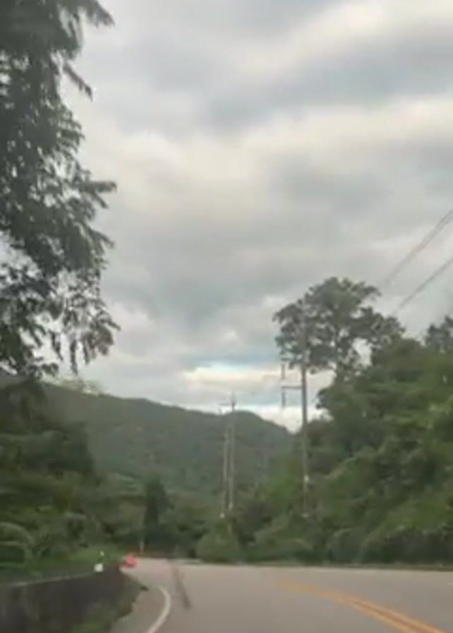 car driving on a paved road through a hilly, forested area. The road has double yellow lines. Orange safety cones are visible on the side of the road. There are utility poles on the right side of the road. The sky is cloudy. The video is shot from the driver's perspective, and the dashboard is visible at the bottom of the frame.