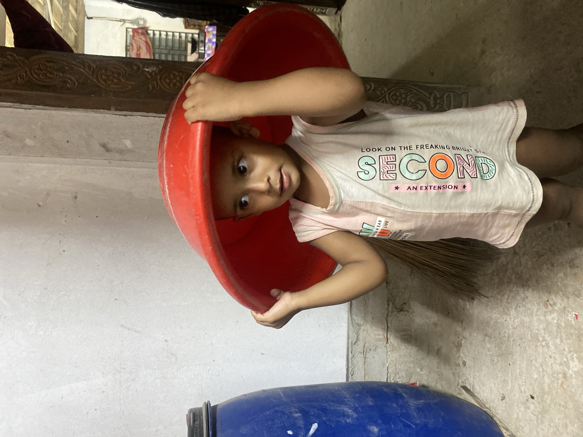 The image captures a young child, appearing male and of South Asian ethnicity, standing indoors in a residential setting. The child wears a light-colored short-sleeved t-shirt featuring graphic text including "SECOND" and "FASHION WEAR LIVE." He is holding a large, red, circular plastic basin inverted over his head, using both hands to support it. The child's gaze is directed slightly to the left of the frame, with a neutral expression. To the immediate left of the child, a tall, cylindrical blue plastic barrel with a black lid is visible, displaying surface scratches and scuff marks. Behind the child's lower body and to the right, the bristles of a broom are discernible. The floor is a textured concrete surface. The wall directly behind the child is light-colored, possibly unpainted or textured plaster, showing minor imperfections. In the background, to the right, a vertical wooden doorframe or pillar with carved decorative patterns is present. Beyond this, a partial view of an adjoining interior space reveals a window with security grates, a dark cooking vessel resting on a surface covered by a patterned cloth, and a draped piece of pink fabric. The scene depicts a functional domestic environment within what appears to be a city in Unknown, Bangladesh.