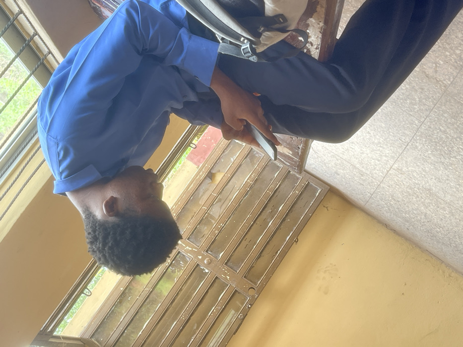 An indoor scene depicts a young adult male, of dark complexion and with short dark curly hair, leaning forward and intently focused on a dark-colored smartphone held horizontally in both hands. He is wearing a long-sleeved blue button-up shirt and dark trousers. A black and grey backpack is partially visible on his right side. The setting appears to be within a building in Uturu, Nigeria, though the specific location within the city is not identifiable from the image. Behind the subject, a multi-pane window with a dark, possibly metallic, frame reveals blurred green foliage outdoors, indicating an external view. Several windowpanes appear frosted, textured, or damaged, and metal security bars are visible across the upper section of the window. The wall to the left is painted a light yellow or cream color, showing some minor marks. The floor is covered with light grey or beige tiles. A weathered wooden surface, possibly a bench or table, is situated to the subject's right.