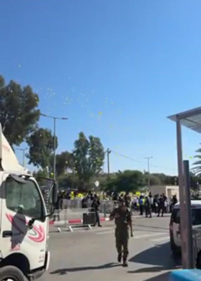 Here’s a description of the video: The video shows a crowd of people gathered on a sunny day, with many yellow balloons floating in the sky. A white truck with "TOYOTA" written on it is parked on the left side of the frame. Several people wearing dark clothing appear to be maintaining order in the crowd. One man in military-style clothing walks purposefully from the background towards the foreground of the shot. There is some sort of metal barrier separating the crowd from the street. The environment includes trees, street lights, and a partially visible building structure on the right side of the frame.
