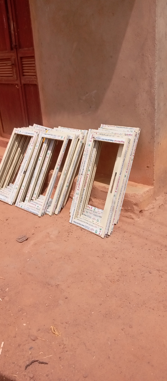 The scene depicts an outdoor area in the city of Rido, Nigeria. In the foreground, reddish-brown, dry soil with scattered small stones and debris covers the ground. A single brown, worn sandal or slipper lies on the soil in the lower-left quadrant. In the midground, approximately twelve light-colored window frames, appearing to be PVC or aluminum, are stacked and leaning against a low, unpainted concrete ledge or step. Visible text on the frames includes "Rongtai Aluminum" and "Always your best choice." The background features a light brown/beige concrete wall, partially shaded by sunlight coming from the right. To the far left in the background, a dark red wooden double door with horizontal louvered panels is partially visible. No individuals are present in the image.