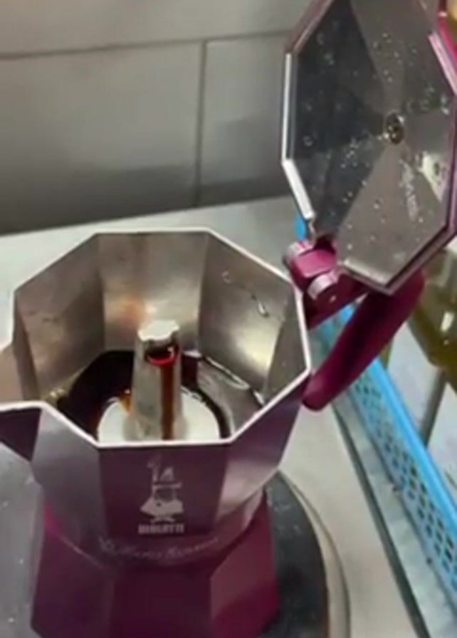 A purple Bialetti Moka Express coffee maker is on a black stovetop burner. The coffee maker's lid is open, showing coffee filling the upper chamber. The background includes a white tile wall and a blue plastic basket containing bottles. The focus is on the coffee brewing process.