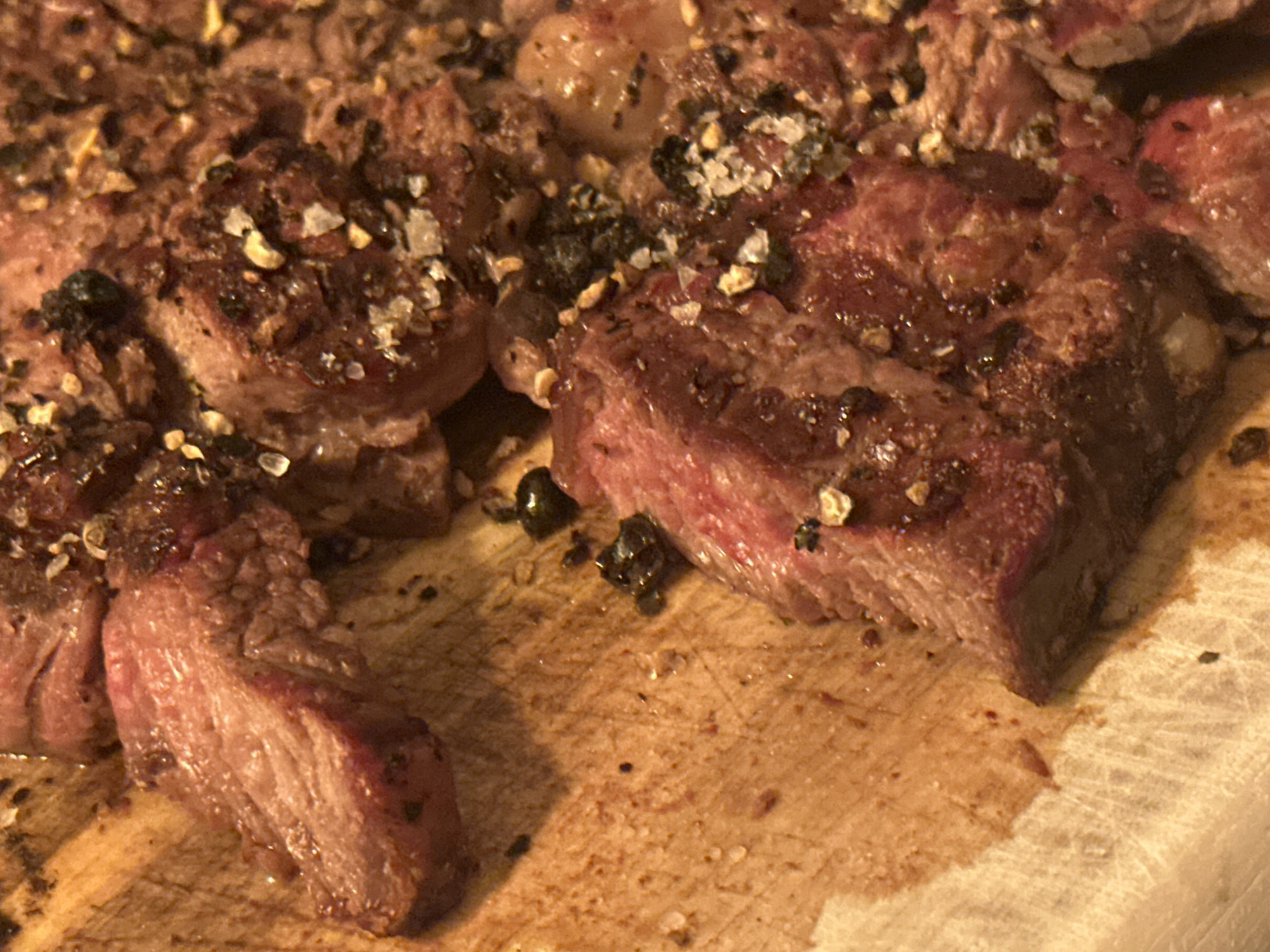 close-up view of a sliced, cooked steak. The steak is seasoned with visible coarse salt and pepper. It rests on a light brown wooden cutting board. The meat is mostly pink with a darker cooked edge. The lighting appears to be warm. There's no indication of the location being Essen, Germany. There are no people or interactions visible.