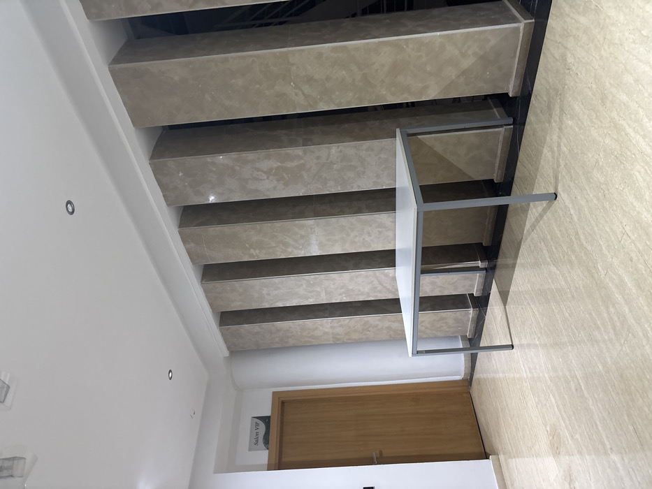 An upward-facing view reveals a modern interior. Light gray marble steps ascend with black risers. To the right, a metallic frame creates a geometric design against the floor. Below the steps, a wooden door is set into a white wall, adorned with a small vertical sign. The opposite wall is smooth and white, punctuated by recessed lighting.