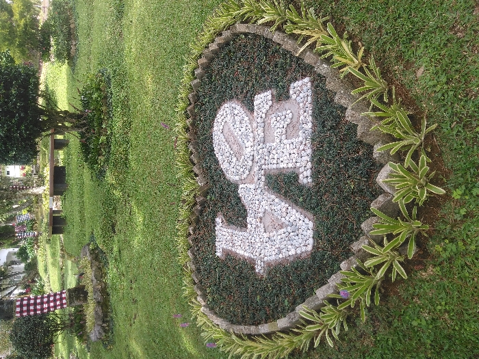 An outdoor scene in a well-maintained garden or park in Cipanas, Indonesia, is depicted under daylight conditions