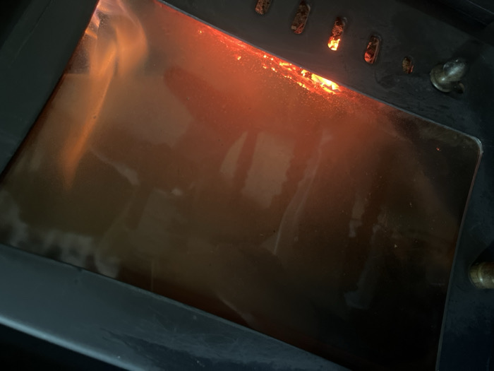 An interior shot of a wood-burning stove or fireplace. The scene is dominated by a slightly frosted window, tinted orange by the fire within. At the top of the frame, glowing embers are visible through ventilation holes. The surrounding metal frame is dark and partially obscures the view, adding depth to the image. The focus is on the interplay of light and shadow created by the fire behind the glass.