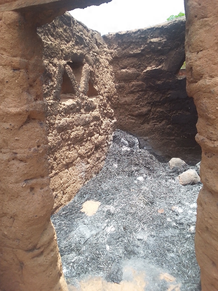 interior of a small mud-brick building in Kwal, Nigeria, located at latitude 9.804 and longitude 8.647. The room is empty except for a layer of charred debris on the floor. There are two small openings on the wall, likely windows, and the walls are made of mud brick. The room appears to have been recently damaged by fire, as evidenced by the charred debris and the blackened walls. The sky is visible through a gap in the roof.