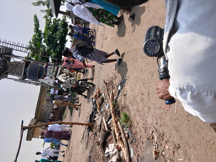 The image depicts an outdoor, unpaved urban street scene in Igbologun, Nigeria, under bright sunlight. The perspective is from a person riding a motorcycle, with the motorcycle's right handlebar and speedometer visible in the immediate foreground, displaying a zero speed reading. The ground is a dry, unpaved dirt surface strewn with wood debris, plastic refuse, and scattered litter. In the mid-ground, numerous individuals are present. On the left, a group of approximately eight people, dressed in various traditional Nigerian attire including kaftans and patterned dresses, are standing and walking. Towards the center, a man in light-colored clothing is pushing a black motorcycle forward. To the right of the motorcycle, a child in a striped dress and a black backpack is walking towards the right frame edge. Further right, additional individuals, including women in white hijabs and patterned dresses, are moving. One woman in a pink dress is holding a small child. In the background, a prominent, tall wooden and metal structure supports a large black plastic water tank, with a ladder attached. Below the tank, a partially legible white banner with red text is visible, containing the phrase "ONE BALE OF...". To the left of this structure, a low, single-story building with a light-colored facade and a dark roof is visible, with clothing hanging outside. A green-leafed tree stands to the right of the water tower. The sky is clear and light, indicating a sunny day. Shadows are visible, consistent with direct overhead sunlight.