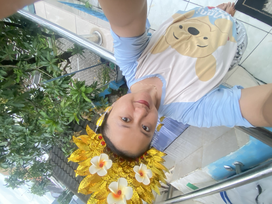 A selfie features a person wearing a blue and white Winnie-the-Pooh shirt. A golden, floral headdress adorns their head. The background includes a leafy green plant and a building with a gray roof. A railing and tiled floor are also visible. The photo appears to be taken from an upward angle, with the person looking directly at the camera.