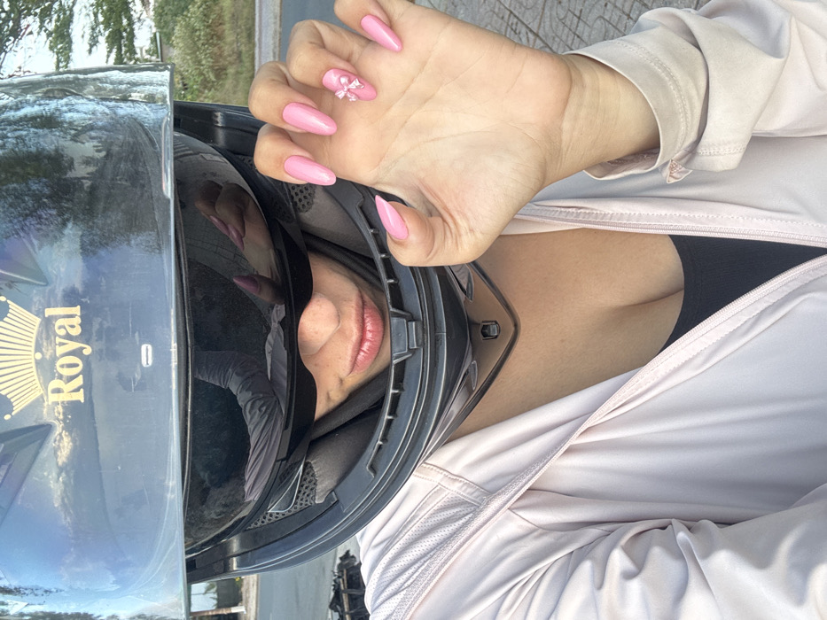An individual is depicted in Cam Đức, Vietnam, wearing a black full-face motorcycle helmet with a dark visor. The helmet bears a gold crown logo and the text "Royal." Reflections of the sky and clouds are visible on the visor. The lower portion of the subject's face, including the nose and mouth with pink lipstick, is visible beneath the visor. The subject wears a light pink zip-up jacket over a black top, revealing a portion of the chest. The left hand is held prominently in the foreground, displaying long, almond-shaped pink acrylic nails; the ring finger nail is adorned with a small white bow. The immediate ground is paved with light-colored blocks. The out-of-focus background shows a road or open area, indistinct dark objects, sparse trees, and a bright, cloudy sky, indicating daylight conditions.