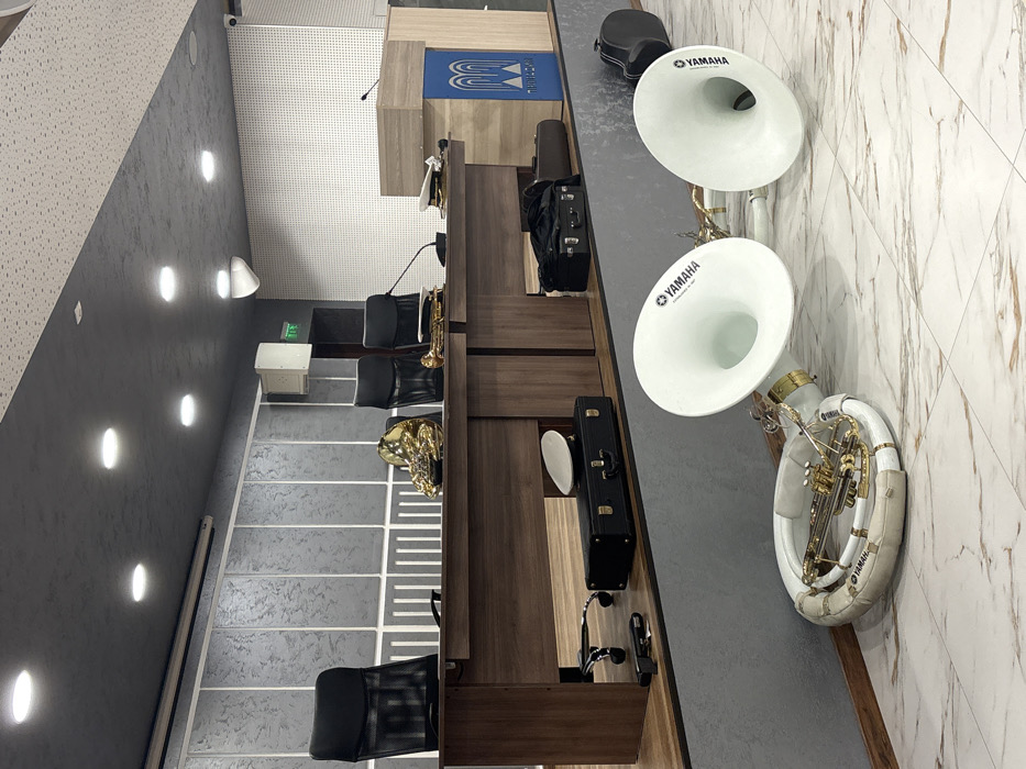 The scene depicts an unoccupied modern municipal hall in Provadia, Bulgaria, identified by the "ПРОВАДИЯ" logo on the blue-paneled podium. The floor is covered with light-colored, marble-patterned tiles. In the immediate foreground, two white and gold Yamaha sousaphones are disassembled and laid horizontally on the tiled floor; one is partially coiled, the other is more extended. A black instrument case rests on the tiled floor in the far right. A raised wooden platform occupies the midground. On this platform, a long, dark brown wooden conference table is set. Behind the table, three empty black office chairs with mesh backs are positioned. On the tabletop, from left to right, are a gold French horn, a smaller brass instrument, two black gooseneck microphones, and a white peaked officer's cap. To the right of the table, a wooden podium with a blue base displaying the "ПРОВАДИЯ" logo is equipped with a microphone. Beneath the conference table, on the wooden floor of the platform, a black rectangular instrument case supports a white disc-shaped object, and another black instrument case is visible to its right. The background wall features grey textured panels with vertical white accents. A white projector screen is rolled up near the ceiling on the left. White perforated acoustic panels cover the wall section behind the podium. The ceiling is dark grey with multiple recessed circular LED lights. A white wall-mounted speaker or camera is affixed to the right wall, and a green exit sign is visible above a doorway opening. No individuals are present in the image.