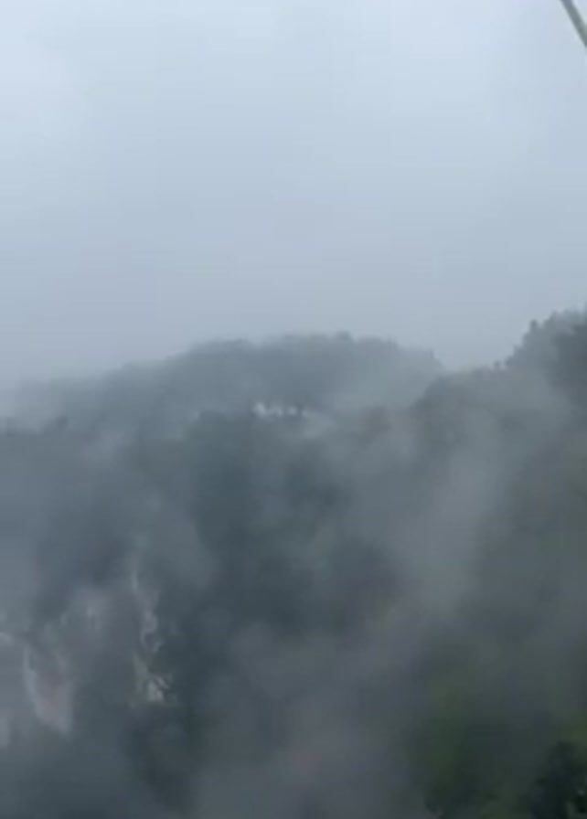 mountainous landscape obscured by heavy fog. Green trees dot the slopes, but visibility is limited due to the dense fog cover. A cable is visible in the upper right of the frame. The atmosphere is misty and overcast.