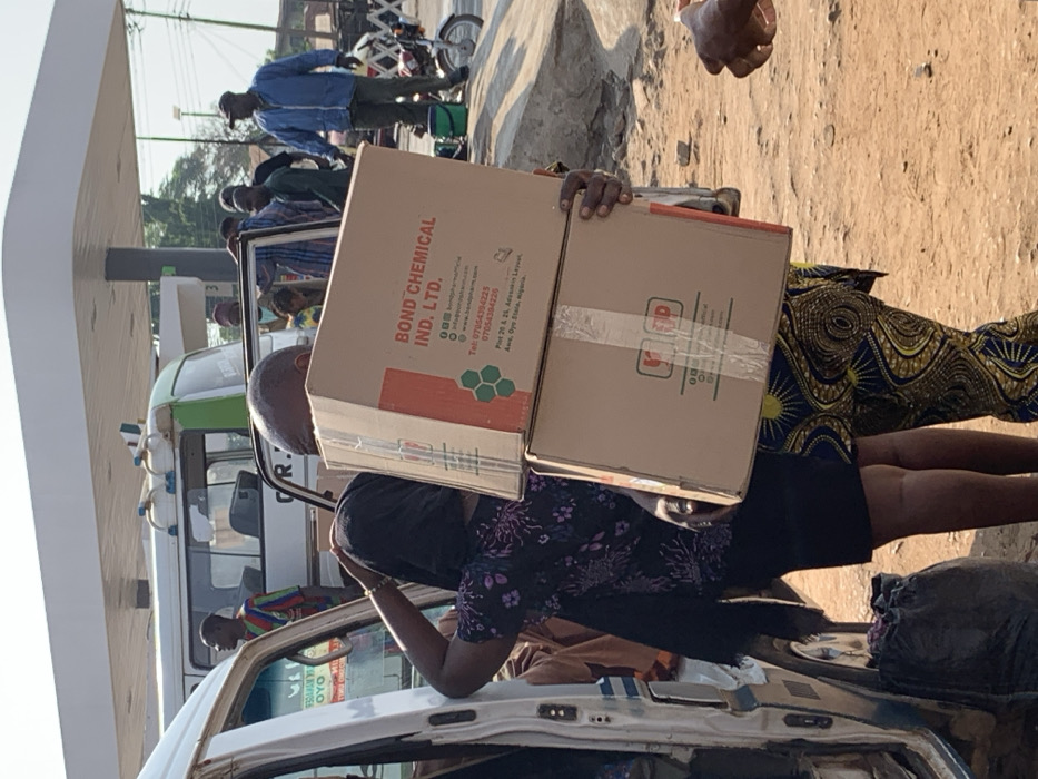 This image depicts a bustling outdoor scene, likely a transport or market area, in Awe, Oyo State, Nigeria. In the foreground, a person, visible from the chest down, wears a yellow, blue, and black patterned garment and holds two stacked brown cardboard boxes. The top box is clearly labeled "BOND CHEMICAL IND. LTD." with contact information and an address stating "Plot 20 & 21, Adesanmi Layout, Awe, Oyo State, Nigeria." To the left, a person in a dark, floral-patterned top and a dark head covering stands next to the open passenger door of a white commercial van or minibus. Their right arm is raised, with fingers touching their head covering. A dark bag is on the unpaved dirt ground beside the van. In the mid-ground, a white minibus with green trim and a roof rack is parked behind the first van. Several individuals are visible in the background: a man in a blue shirt and dark cap stands to the right, next to a white motorcycle and a green bucket. Other figures are scattered around the vehicles, including one in a multi-colored striped shirt near the first van. A large white canopy structure, supported by gray pillars, dominates the upper background, under natural daylight. The ground throughout the scene is predominantly unpaved dirt.