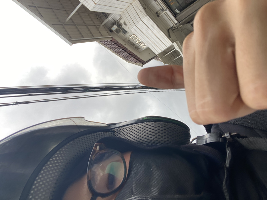 The image presents a low-angle, close-up view focused on an individual and their immediate urban surroundings under an overcast sky. In the foreground, partially obscuring the left side of the frame, is a person wearing a black motorcycle helmet with a grey mesh interior lining. The person wears tortoise-shell framed glasses, with a green light reflection visible on the left lens, and a black face mask covering the lower portion of their face. Their right hand is prominently displayed in the lower-right quadrant, forming a thumbs-up gesture; faint horizontal creases are visible across the back of the hand and knuckles. In the background, against a grey, cloudy sky, multiple black utility wires stretch horizontally across the middle of the frame. To the right, a multi-story building is visible, featuring a reddish-brown tiled roof. The building's facade is constructed with white, rectangular tiles, and multiple air conditioning units are mounted on its exterior. A sign on the building displays "Toko Roti & Kue PAPILLO," indicating a bakery and cake shop. Below this, a partial sign with the letter "P" is discernible. This establishment, "PAPILLO Toko Roti & Kue," identifies the location as a commercial area within East Jakarta, Indonesia.