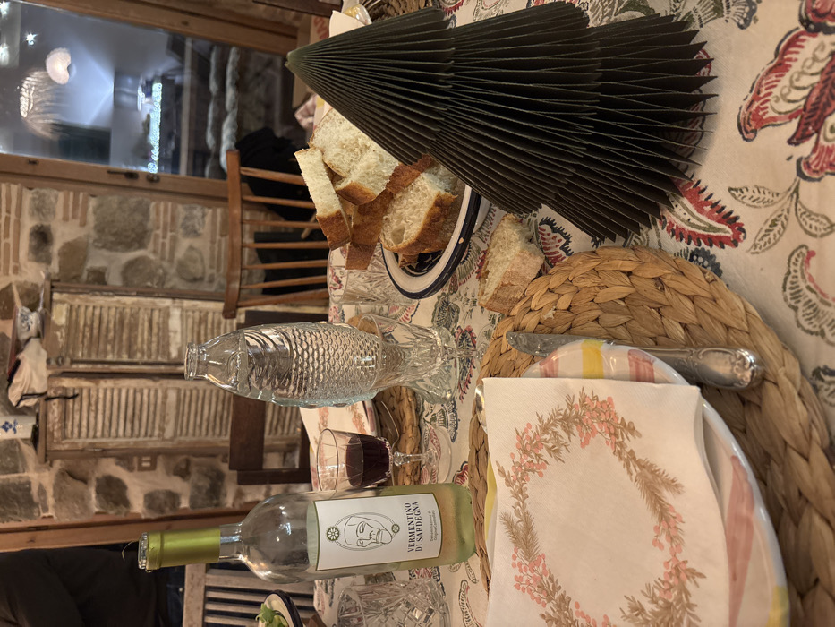 A dining table is set with a floral tablecloth. A woven placemat supports a plate topped with a floral napkin and a knife. A clear, fish-shaped water bottle sits nearby, along with a glass of red wine and a bottle of Vermentino di Sardegna. A plate holds bread slices. A dark, fan-like object rests atop the arrangement. The background features a stone wall, a window, and a wooden chair.