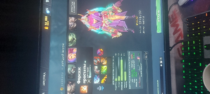 The image displays a Dota 2 screen featuring the "Forsaj prostati" Anti-Mage player profile. The player's stats for the match are 19 kills, 6 deaths, and 32 assists. The player possesses 14,055 gold. Their hero's build includes items like Battle Fury, Manta Style, and Butterfly. The game duration is 56:12. Other UI elements include navigation buttons for "Library," "Effects," and "Best Player," along with options to "Rejoin Team" and "Play." A computer keyboard and mousepad can be seen on the right side of the image.