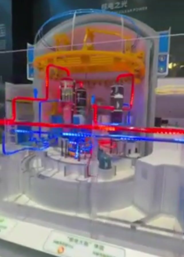 detailed model of a nuclear power plant, encased in a clear enclosure. The model includes various components connected by illuminated red and blue tubes, likely representing hot and cold water pathways. Yellow elements highlight certain areas. The model is displayed on a grey platform with Chinese text and English text that reads "The Radiance of Nuclear Power". The background is a dark display with blue accents.