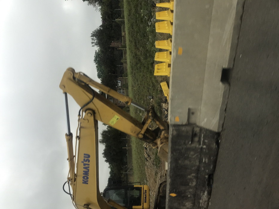 The image depicts an outdoor construction or roadside area in Sandton, South Africa, under an overcast, light grey sky. In the immediate foreground, an asphalt road surface is visible. Above the road, two concrete K-rail barriers are present; the left barrier exhibits a darker, weathered appearance, while the right barrier is lighter and appears newer. Both barriers feature small, rectangular orange reflective markers. Behind these barriers, a large yellow Komatsu hydraulic excavator is positioned on disturbed, earthen ground. The "KOMATSU" brand name is clearly displayed in blue lettering on its boom and the side of its cab. The excavator's boom and arm are extended, with its bucket resting near the ground. To the right of the excavator's bucket, a series of seven yellow plastic traffic barriers or cones are arranged on the ground; one barrier in the foreground appears to be lying on its side. Further in the background, a green grassy embankment slopes upwards. Behind the embankment, a metal chain-link fence runs horizontally across the frame. Beyond the fence, a dense line of trees is visible, and behind these trees, multiple faint brick structures are discernible. No human figures or active interactions are observed within the frame.