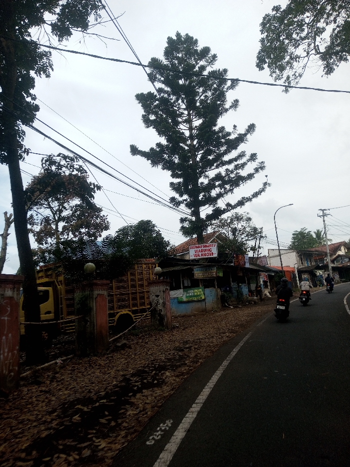 The scene depicts a street in Sat Thay (East), Myanmar, under an overcast sky. A dark asphalt road, bordered by a white solid line on its right edge, curves gently to the right in the mid-ground. Faint white numerals are visible on the asphalt near the bottom left. Three motorcycles, each with a single rider wearing dark helmets and attire, are observed traveling away from the viewer on the right side of the road. To the immediate left of the road is a dirt and debris-strewn area, largely covered in dark brown fallen leaves. Two reddish-brown concrete pillars, each topped with a spherical finial, stand at the edge of this area. Behind these pillars, a yellow flatbed truck with a wooden cage-like structure on its bed is parked, its front cab partially obscured by a tree. A single-story commercial building fronts the road to the right of the parked truck. A white banner with red Indonesian text, "DAFTAR PEMBANTU WARUNG WA ANGAN," is affixed to its facade. The building features a dark, possibly corrugated, roof over a covered porch area and light blue/green walls. Behind and to the right, a residential-style building with a reddish-brown tiled roof is visible. Prominent trees with dark foliage, including a tall, dense, pine-like tree in the center-right, frame the upper portion of the image. Numerous dark utility wires crisscross the sky, with a street lamp pole visible on the far right.