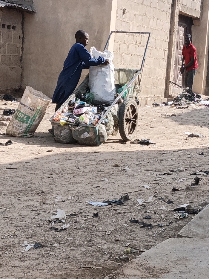 An outdoor, unpaved street or open area in Gwagwarwa, Nigeria, is depicted under bright daylight. The ground is light brown dirt, heavily littered with paper scraps, plastic bags, and general refuse. In the foreground, a large, off-white sack with green text, partially readable as "DORAMA" and "HDPE," lies on the ground to the left. Central to the image, a young male, wearing a dark blue long-sleeved garment, pushes a two-wheeled handcart. The cart, constructed with a light-colored metal frame and dark spoked wheels, is overloaded with collected refuse, including a prominent white sack and various plastic bags and wrappers. The individual's hands are on the white sack, positioned to push the cart forward. In the midground to the right, an adult male, dressed in a red short-sleeved shirt and dark pants, stands in front of a building entrance. He holds a dark, long-handled rake, actively raking a pile of dark debris directly in front of a dark brown wooden door with a lighter frame, set into a building constructed of light brown/tan mud or clay bricks. The building shows exposed blockwork above the door. A second building, also of light-colored bricks, is partially visible to the left.
