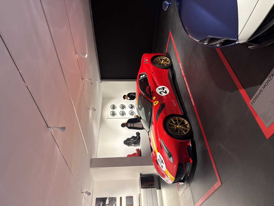 The scene depicts an interior view of a high-end automotive showroom or museum, specifically identified as being in Maranello, Italy